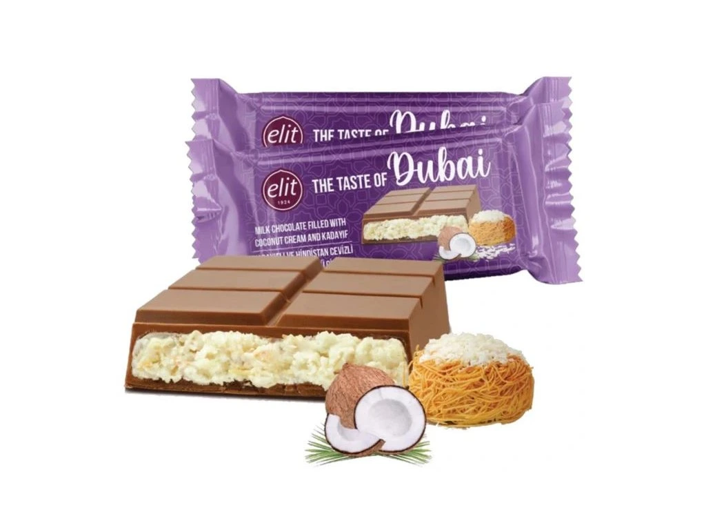 Dubai Kokos voní létem a tropy! Kombinace voňavého kokosového krému, křupavého kadaifu a mléčné čokolády se slévá v naprosto neodolatelnou čokoládu, která svou chutí evokuje dovolenou!