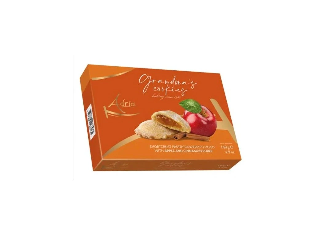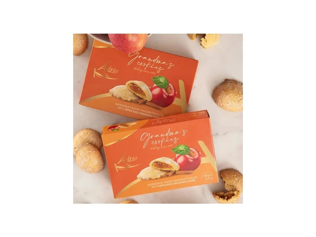 Pro milovníky vůně domácí kuchyně přinášejí sušenky Adria s jablečnou a skořicovou náplní kombinaci jemných sušenek a aromatické náplně.